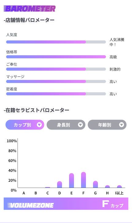 たとえば、在籍セラピストの年齢層や、どのバストサイズが多いのかなどがグラフで表示されるので、傾向をひと目で確認することができます。